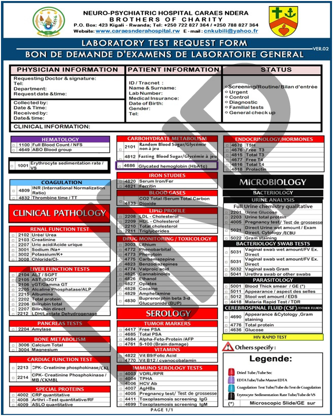 Ndera Neuro-Psychiatric Teaching Hospital's Laboratory service plays an essential role in determining clinical decisions and providing clinical information that help in prevention, diagnosis, treatment, and management of mental health diseases, drug monitoring tests across the country and abroad. We do different tests according to clinician needs related to the above mentioned domains. We do different tests according to physicians request within the laboratory scope of services.
